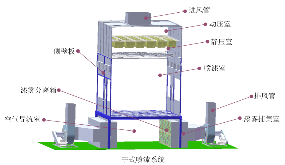 本文介紹了一種新型干式噴漆室,該噴漆室采用上送風、下排風的方式工作,噴漆室的格柵板之下的兩側(cè)布置折流式漆霧捕集箱。折流式漆霧捕集箱為公司研發(fā)的專利產(chǎn)品,此捕集箱采用慣性力和離心力的原理捕集漆霧,對漆霧的捕集容納能力大,對漆霧的分離效果好。數(shù)個折流式漆霧捕集箱安裝于噴漆室的排風口處,使整個噴漆室運行穩(wěn)定,漆霧捕集箱的更換頻率低,操作維護簡單,節(jié)能環(huán)保,是傳統(tǒng)文丘里/水旋式噴漆室的絕佳替代產(chǎn)品。
