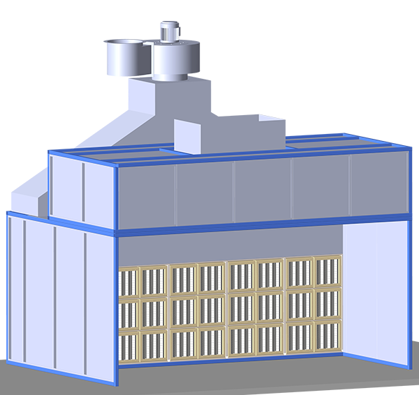 漆霧分離室位于噴涂作業(yè)室的一側(cè),內(nèi)部設(shè)置一排折流式漆霧分離箱。空氣攜帶過噴的漆霧由噴涂作業(yè)室的一側(cè)進(jìn)入折流式漆霧分離箱,在空氣折流式漆霧分離箱過程中,空氣中的漆霧被分離。潔凈的空氣由漆霧分離箱排出,進(jìn)入分風(fēng)管,而后進(jìn)入主風(fēng)管。