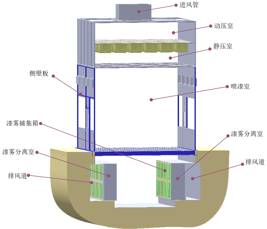 雙面?zhèn)任墒絿娖崾乙来伟ㄟM(jìn)風(fēng)管、動(dòng)壓室和靜壓式、噴漆作業(yè)室、漆霧捕集分離室、排風(fēng)管、排風(fēng)機(jī)等。